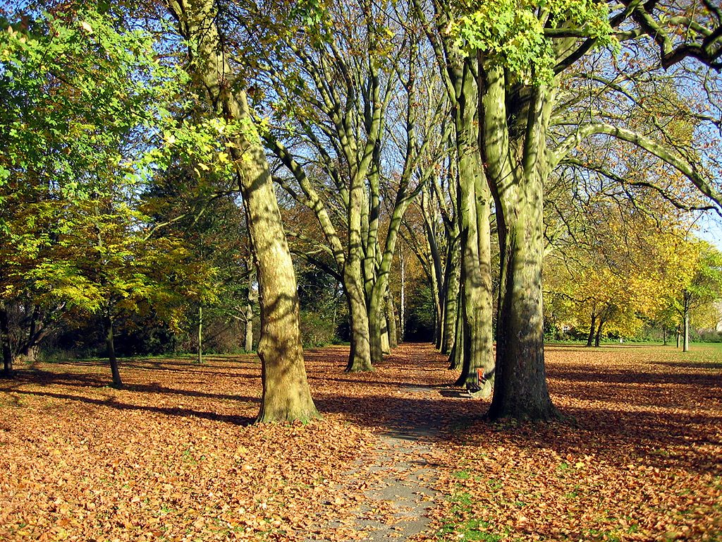 Eine großartige Platanenallee säumt den Weg durch den Park, er ist leider nicht mehr begehbar.