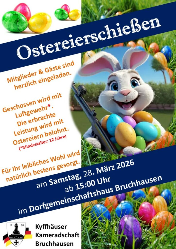 Die Kyffhäuser Kameradschaft Bruchhausen lädt alle Mitglieder und Gäste herzlich zum diesjährigen Ostereierschießen ein.
